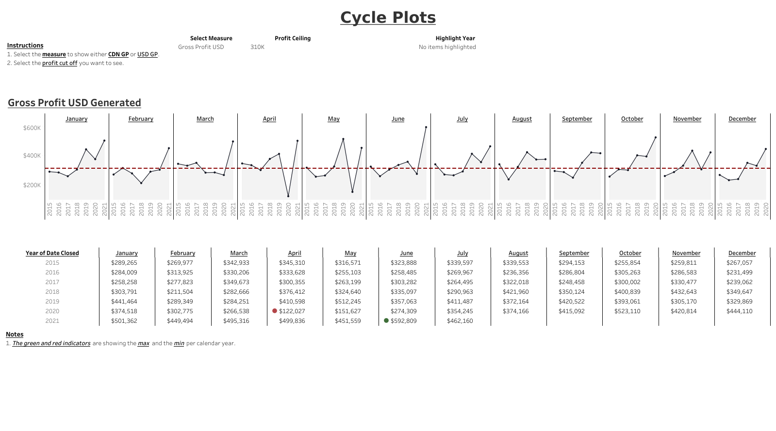 Use case: This view shows the audience a breakdown by month vs. the same period last year to see problematic or outperforming months. It gives an overall performance while showing individual contributions.