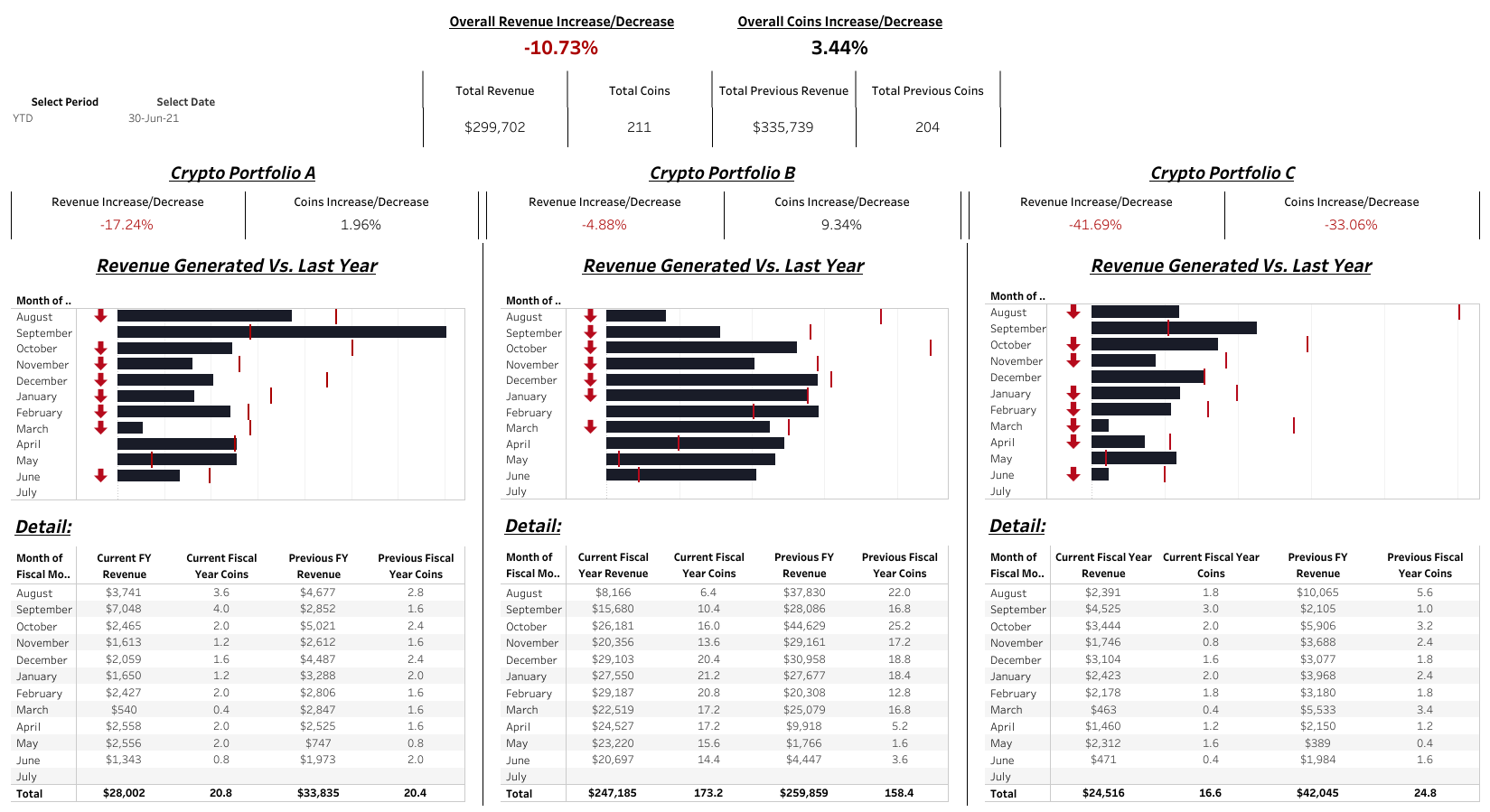 Use case: This view allows the audience to spot decreases in transactions, revenue, or average performance against the same period and see what months are down or up.