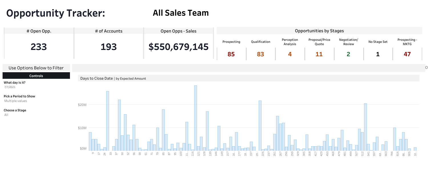 Use case: This view allows users to select a time frame. The following 60 days for example, dissect it by opportunity stage and find out how much revenue is projected to come.