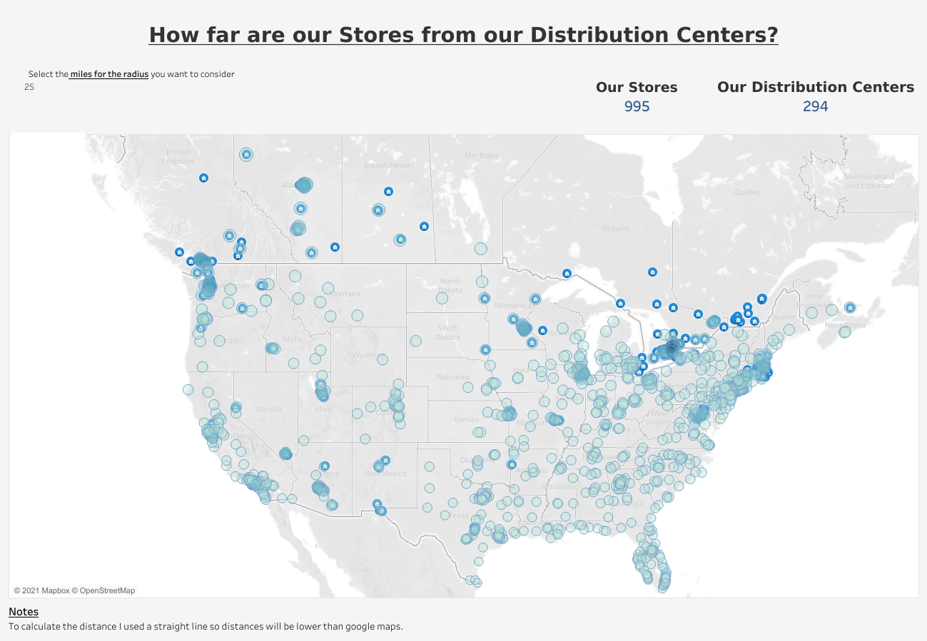Use case: This map lets us control a milage radius to plan how far we want our distribution center's territory. Plotting it against stores or zones of interest and combining it with population data is a great way to project new store openings.